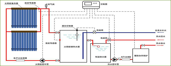 熱(re)(re)管真空管太(tai)陽(yang)能(neng)(neng)集(ji)中熱(re)(re)水系(xi)統(tong)(tong)(tong)采用熱(re)(re)管真空管集(ji)熱(re)(re)器為吸熱(re)(re)部(bu)件,通過智(zhi)能(neng)(neng)控(kong)制系(xi)統(tong)(tong)(tong)控(kong)制循環(huan)泵(beng)的運(yun)行,將集(ji)熱(re)(re)器收集(ji)到的太(tai)陽(yang)能(neng)(neng)量(liang)源源不(bu)(bu)斷的傳輸(shu)到集(ji)中儲熱(re)(re)水箱,由(you)儲熱(re)(re)水箱向熱(re)(re)水系(xi)統(tong)(tong)(tong)供應溫(wen)度適宜的衛生熱(re)(re)水。太(tai)陽(yang)能(neng)(neng)不(bu)(bu)足的陰雨天氣,由(you)輔助加(jia)(jia)熱(re)(re)設備向系(xi)統(tong)(tong)(tong)補(bu)充熱(re)(re)量(liang)。該系(xi)統(tong)(tong)(tong)為大型(xing)(xing)熱(re)(re)管式(shi)太(tai)陽(yang)能(neng)(neng)熱(re)(re)水系(xi)統(tong)(tong)(tong),全(quan)自動運(yun)行,可實現計算機智(zhi)能(neng)(neng)化控(kong)制,性(xing)能(neng)(neng)可靠,使用方(fang)便,具有定溫(wen)出水、循環(huan)加(jia)(jia)熱(re)(re)等(deng)功能(neng)(neng)。完(wan)全(quan)實現全(quan)日制24小(xiao)時連續熱(re)(re)水供應的大型(xing)(xing)熱(re)(re)管式(shi)太(tai)陽(yang)能(neng)(neng)熱(re)(re)水系(xi)統(tong)(tong)(tong)。