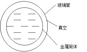 在一定外徑(如126mm)的真空玻璃管內,裝有直徑略小(如100mm)的金屬筒體(如不銹鋼筒等),金屬筒體外表面有吸收率高而發射率低的選擇性涂層(如吸收率為0.91,發射率為0.12),玻璃管與金屬筒體之間抽成真空。該產品的保溫性能很好,熱損失比其他幾種悶曬式太陽能熱水器小得多。