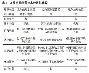 在混合動力熱水系統中,在滿足使用要求的前提下降低家庭能源支出是系統設計的基本原則,因此,在運行過程中獲得單位熱量成本較低的熱源裝置將處于優先地位,系統配置將其作為基本熱源裝置優先利用該裝置獲得的熱能,只有在基本熱源裝置無法滿足使用要求的情況下,輔助熱源裝置才投入運行。幾種常見熱源裝置的技術經濟性如表1所示。
