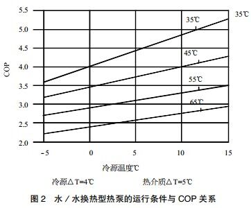 而用于采暖和衛生熱水的系統中,利用熱泵獲得采暖熱水在過渡季節(環境溫度≥-7℃)優勢十分突出,不過需要注意,利用熱泵采暖的最有利運行參數是低溫地板供熱或類似的輻射供熱方式,因此,熱泵裝置的冷凝溫度對熱泵運行經濟性關系密切。圖2所示為熱泵運行條件與性能系數(COP)的關系,COP定義為單位電力消耗的制熱量,是最重要的運行經濟性指標,顯較高的COP值就意味熱泵較省電。此外,具有夏季空調制冷功能的熱泵在進行制冷運行時,利用熱泵排出的余熱加熱衛生熱水,從這個角度來看,在這時獲得的熱水是無需付出能源代價的。這種產品在上世紀80年代中期在日本批量進入市場之后,一直是熱泵熱水器類產品的主流,目前在日本市場的年銷售量約50萬臺,市場占有率約50%。顯然,燃氣采暖鍋爐的供熱性能幾乎不受氣象條件的影響,而且出水溫度可以高達80℃,但是,如果與空氣源熱泵集成運行,也應盡可能以低出水溫度的運行狀態運行。